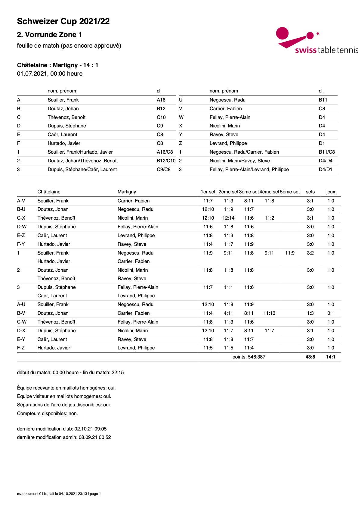 Les classements nous donnaient un avantage et le résultat confirma cet avantage. Le score final de 14-1 pour le CTT Châtelaine nous donne la possibilité de poursuivre notre aventure en coupe suisse. Gageons que la suite sera plus difficile!