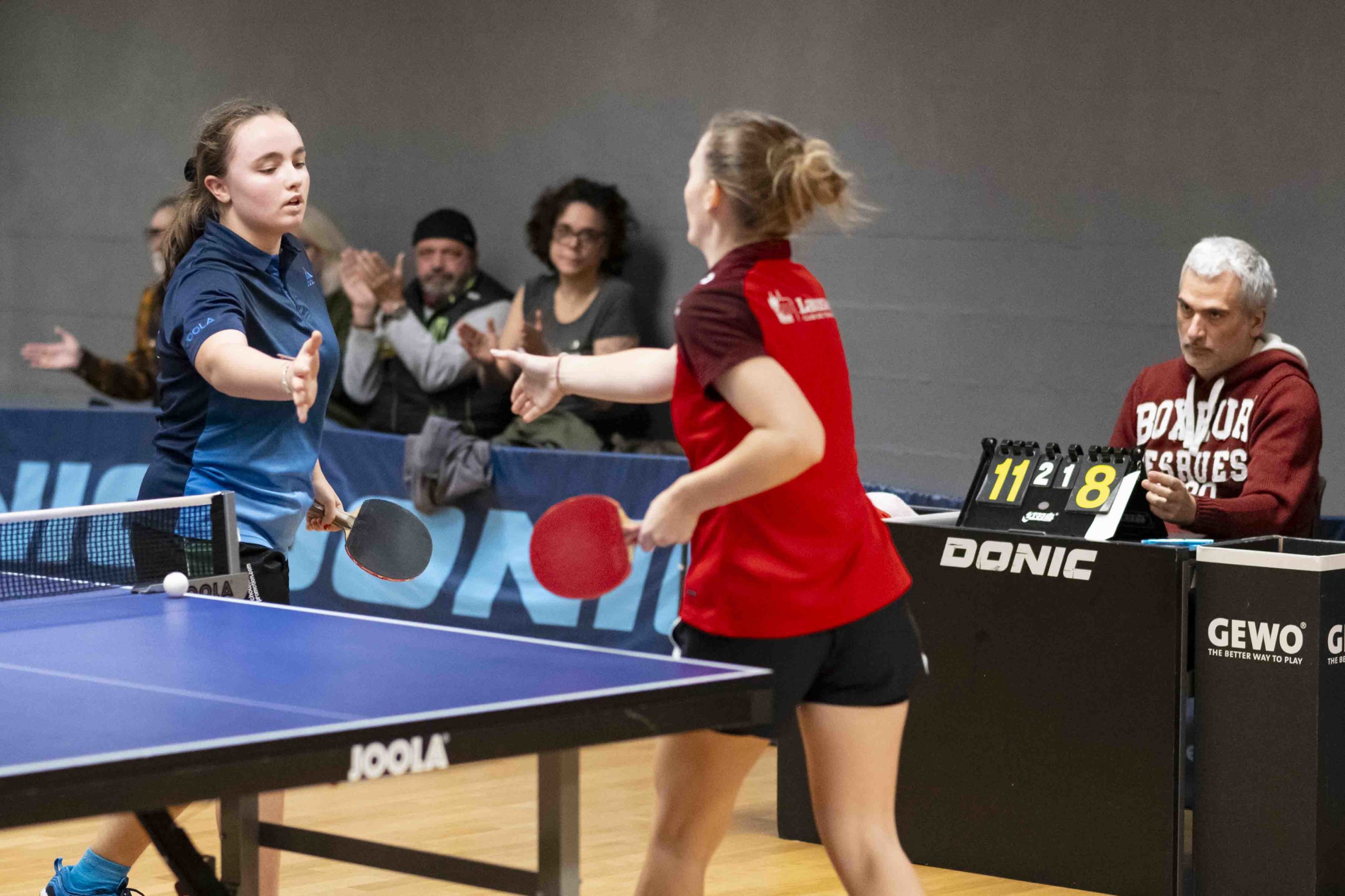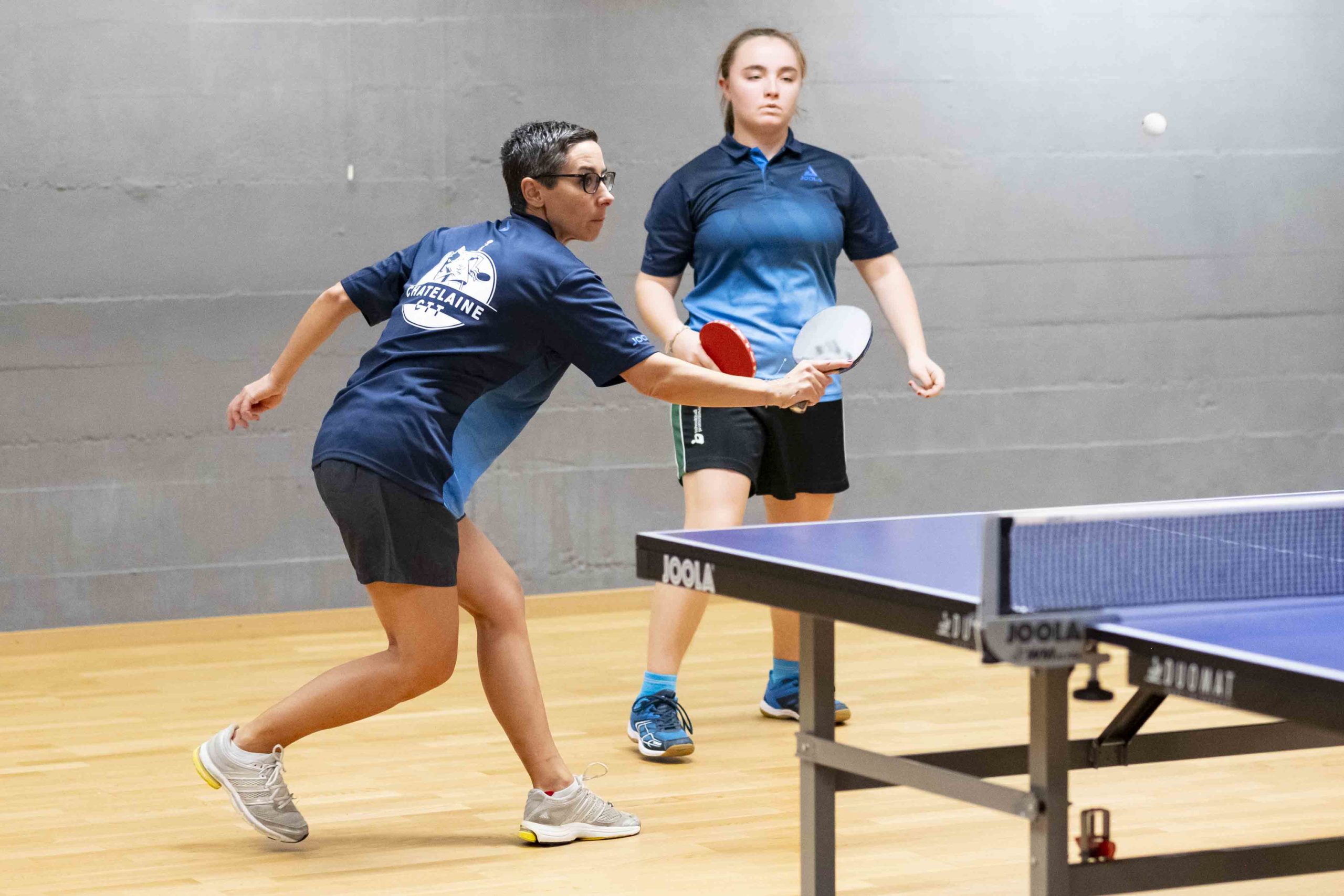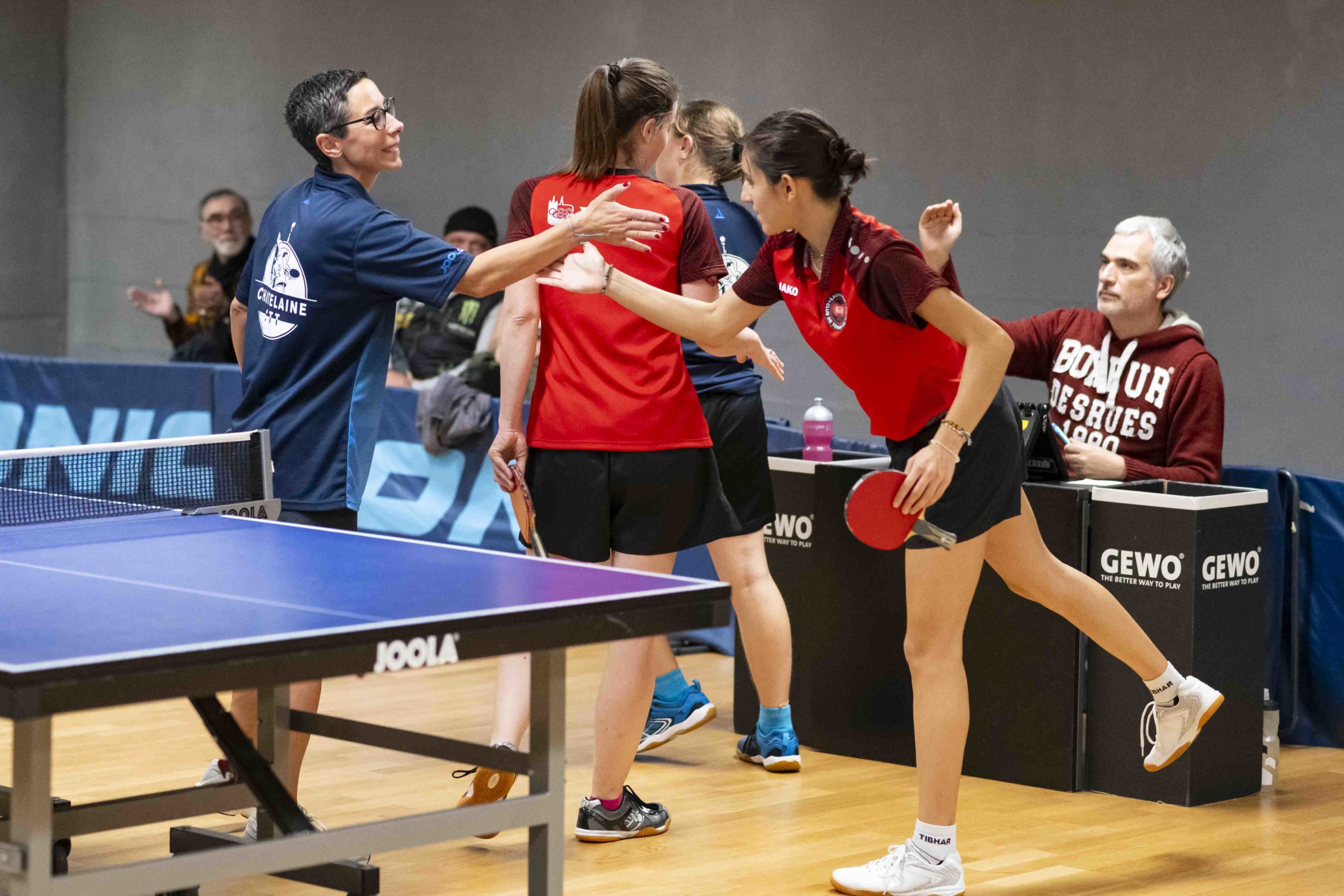 Félicitations à Livia qui réussit à gagner 2 matchs et le double. Virginie, doyenne de l’équipe, mais toujours aussi positive et sympathique, finit avec 1 victoire et le double. Élodie passe à un cheveu d’une belle perf lors de son dernier match en menant 9-5 au 5e set avant de s’incliner 9-11.